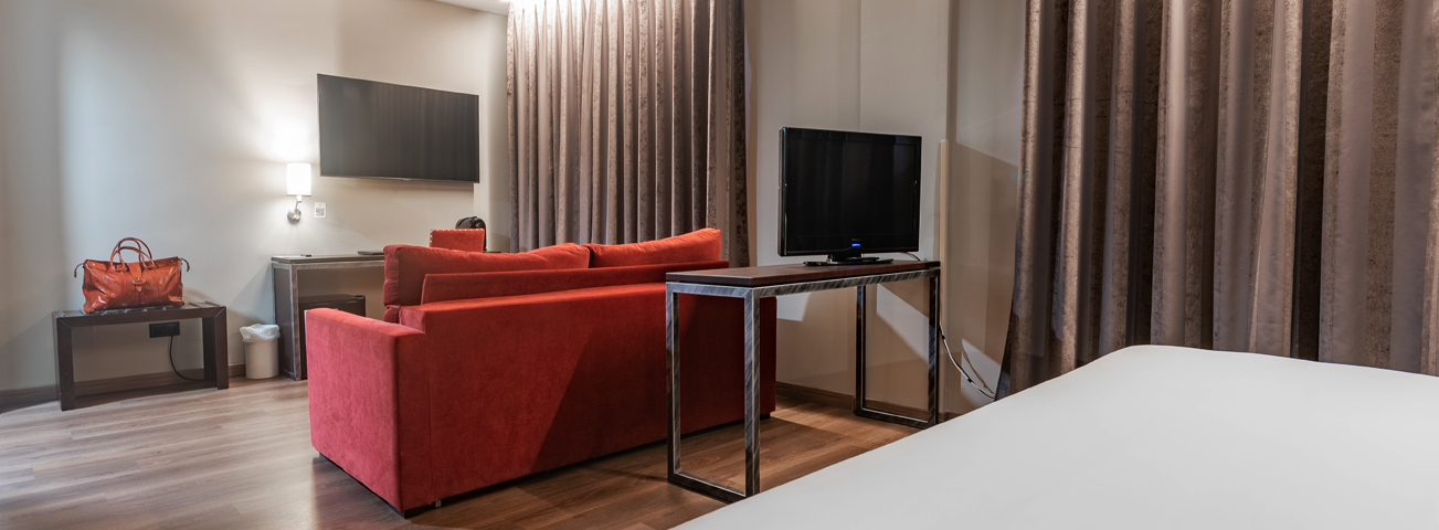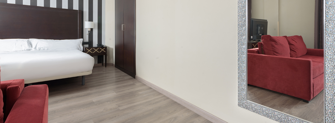 Habitación con cama doble extra grande y sofá pensada para 2 adultos. Cuenta con los mismos servicios que el resto de habitaciones en un amplio espacio. Dispone de minibar, climatización regulable, sofá, Wi-fi gratuito, caja de seguridad, escritorio, TV de plasma etc…